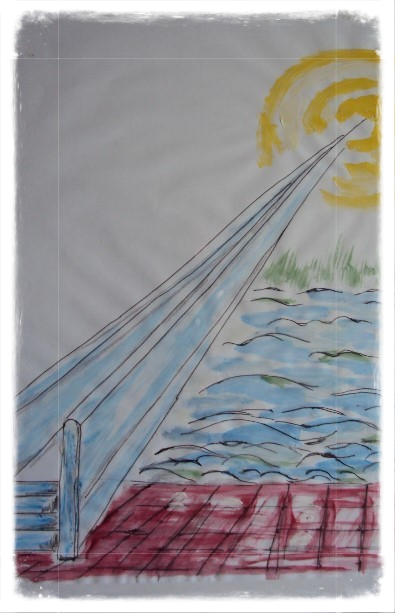 Boven: tekening achter glas titel: brug naar de toekomst 2020